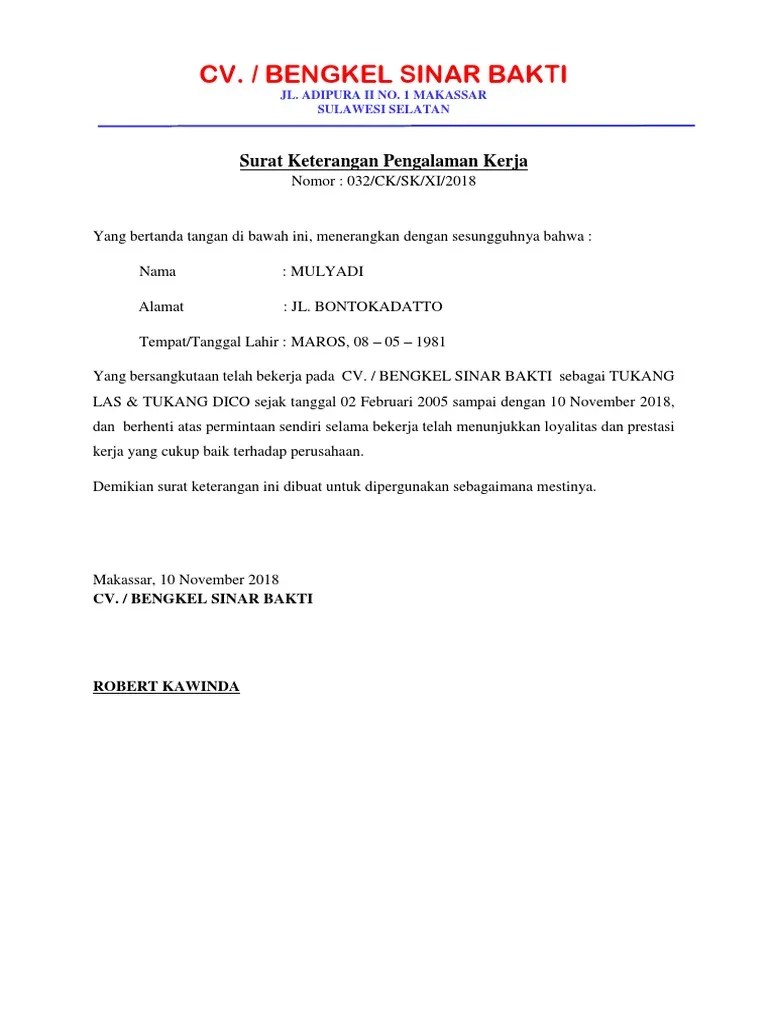 Contextual translation of surat keterangan kerja into english. Daftar pengalaman praktik di bidang akuntansi yang dilengkapi dengan surat keterangan bekerja. Scan kartu tanda penduduk (ktp); Tidak perlu menyatakan alasan yang bersangkutan resign dalam surat pernyataan pengalaman kerja; Traslid, a sick note, death certificate, . Sertakan cap dan tanda tangan dari perusahaan terkait agar lebih . Pas photo format.jpeg (1 file) . See more ideas about surat, . Download formulir download petunjuk pengisian. .com surat keterangan pengalaman kerja no. Title slide of surat keterangan pengalaman kerja (esindomt)